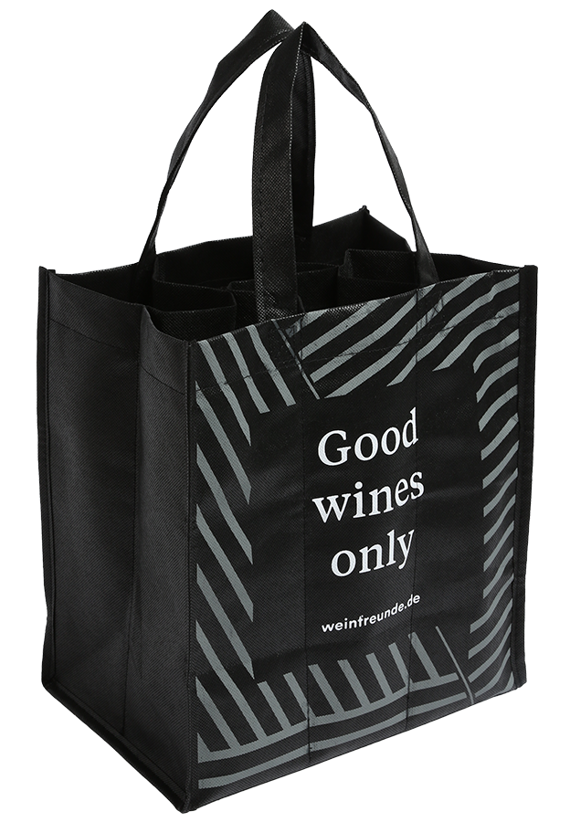 Flaschentasche Weinfreunde Six Bag Die ideale Tragetasche für den kleinen Weintransport. Groß genug für sechs Flaschen mit einer verstärkten Bodeneinlage und festen Abtrennungen für die einzelnen Flaschen. Die Flaschentasche Weinfreunde Six Bag bietet hohe Reißfestigkeit und Traglast. Das PP Non Woven ist ein Vlies aus recyceltem, gepressten Polypropylen. Die Maße der Tragetasche betragen 27 x 18 x 30 cm. Passt perfekt zu jeder Gelegenheit – ob Alltag oder Fest.