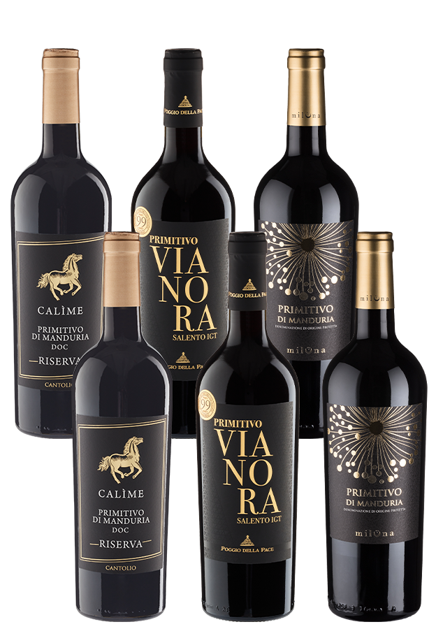 Mit Manduria und Salento aus den besten Anbaugebieten Apuliens und mit Winzerhandwerk vom Feinsten – das kitzelt jede Menge Eleganz aus den opulenten Rotweinen. Premium-Paket mit dem Primitivo di Manduria Calime Riserva, dem Vianora Primitivo Salento und dem Miluna Primitivo di Manduria. Eine abwechslungsreiche Auswahl für Weinliebhaber und Neugierige.