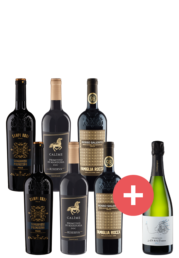 Drei kraftvolle Rotweine aus Apulien – und ein Champagner gratis dazu! Der Rocca Sangiovese Primitivo, der Calime Primitivo di Manduria Riserva und der Rosso Salento von Famiglia Rocca bringen süditalienische Wärme, dunkle Frucht und samtige Fülle auf den Tisch. Perfekt zu Osterbraten, Lamm oder herzhaften Vorspeisen. Der Clé de la femme Champagner sorgt für den prickelnden Auftakt ins Fest. Eine abwechslungsreiche Auswahl für Weinliebhaber und Neugierige.